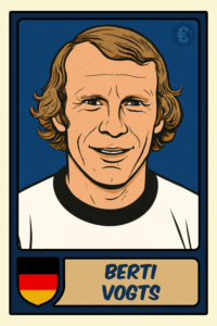 Zagueiro alemão incansável, Berti Vogts foi peça-chave na seleção da Alemanha Ocidental, conquistando a Euro 1972 e a Copa do Mundo de 1974. Apelidado de “Terrier” por sua marcação feroz e incansável determinação, destacou-se no Borussia Mönchengladbach, onde venceu múltiplos títulos nacionais e internacionais. Sua disciplina tática, resistência e garra fizeram dele um dos grandes defensores da história do futebol alemão.