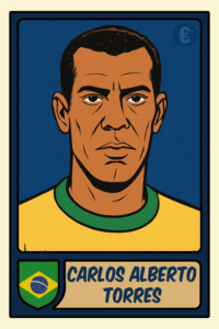 Capitão do Brasil na Copa de 1970, Carlos Alberto Torres era um lateral-direito de porte atlético, velocidade e técnica refinada. Dono de um estilo elegante, destacava-se pela força, arrancadas e precisão nos passes. Marcou um dos gols mais icônicos da final contra a Itália. Brilhou no Santos e no Fluminense antes de atuar nos EUA e virar treinador. Considerado um dos maiores laterais da história, eternizou-se como o “Capitão do Tri”.