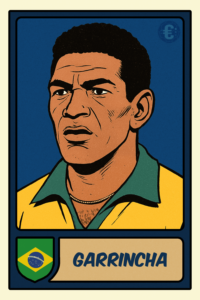Garrincha, “o Anjo das Pernas Tortas”, é uma das maiores figuras da história do futebol brasileiro. Com habilidade única de drible e velocidade, ele foi fundamental nas vitórias da seleção brasileira nas Copas de 1958 e 1962. Garrincha jogou principalmente no Botafogo e foi o grande nome da seleção em 1962, após a lesão de Pelé. Sua alegria e dribles marcantes o tornaram um ícone eterno do futebol mundial.